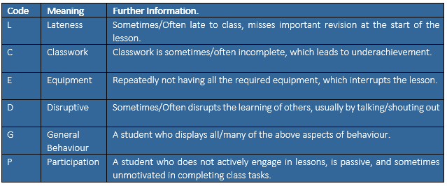 Information about attitude to learning grades and codes can be found here: